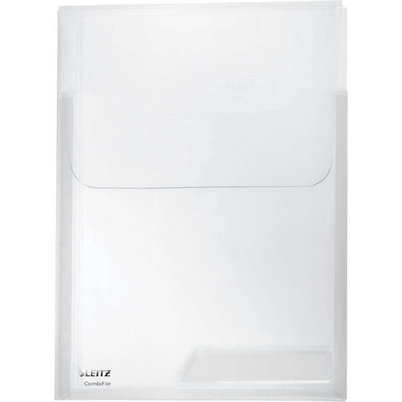 Chemises à soufflet LEITZ® CombiFile Maxi combinaison d'une chemise et d'une pochette transparente, avec bande perforée rétractable, dos extensible pour le rangement de documents épais ou de catalogues jusqu'à 150 pages, en PP résistant, n'altèrent pas les documents, avec rabat sur le dessus pour protection optimale du contenu et porte-étiquette avec étiquette en papier, idéales pour le transport, format A4. Sachet de 3 pièces.