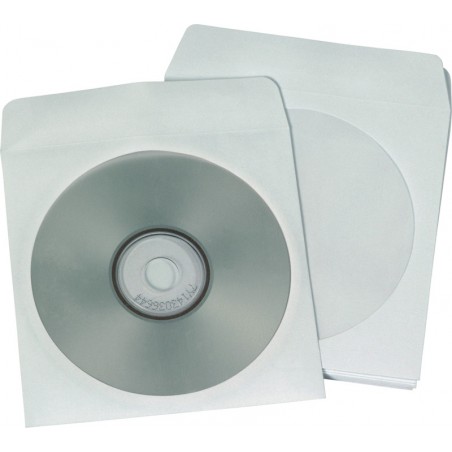 Pochettes pour CD/DVD Q-QONNECT®, en papier avec fenêtre transparente, rabat autoadhésif, format 124 x 124 mm. Emballage de 100 pièces.