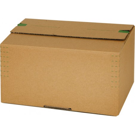 Boîte pliante GRÜNMARIE® Fix carton ondulé résistant, montage aisé grâce à une mise en place rapide et sûre du fond, fermeture autoadhésive, bandelette d'arrachage. Durabilité eco:plus: compostable, dégradable, recyclable, composant recyclé.