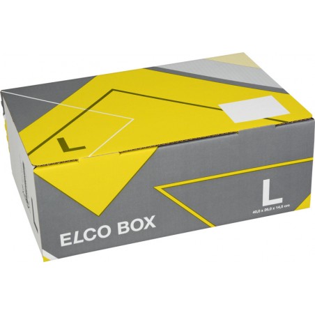Carton d'expédition ELCO Elco Box jaune/anthracite carton d'expédition solide, livré à plat, montage aisé grâce à 4 points de colle prêts à l'emploi, languette de fermeture assurant un blocage de sécurité. Durabilité eco:plus: construit pour être démontable, recyclable. Certification: FSC.