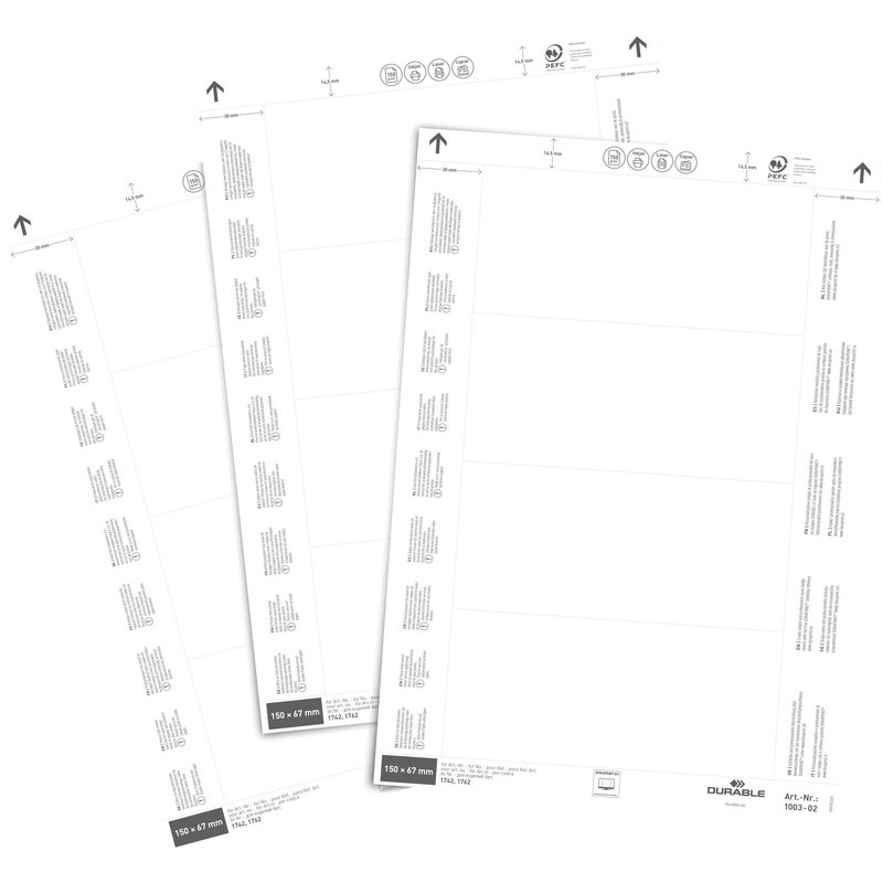 Insertions pour pochettes logistiques DURABLE blanches, planches d'insertions microperforées, format A4, pour une impression professionnelle des étiquettes dans l'entrepôt et la production, compatibles avec les pochettes d'identification DURABLE, inscription facile avec le logiciel d'étiquetage gratuit Duraprint® sur www.duraprint.fr. Pour copieurs, imprimantes laser, jet d'encre, laser couleur et copieurs couleur. Durabilité eco:plus: recyclable.