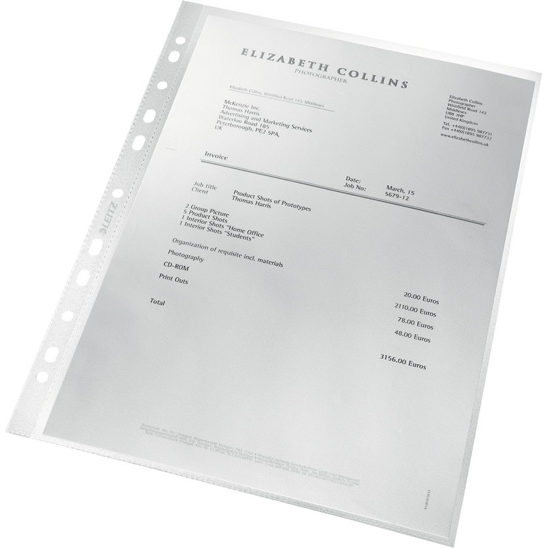 Poches transparentes LEITZ® re:cycle en PP recyclé, surface grainée, ouverture en haut, copysafe, bande perforée transparente renforcée. Durabilité eco:plus: recyclable, composant recyclé, teneur en déchets recyclés avant utilisation max. 90%. Certification: CO2 compensé.