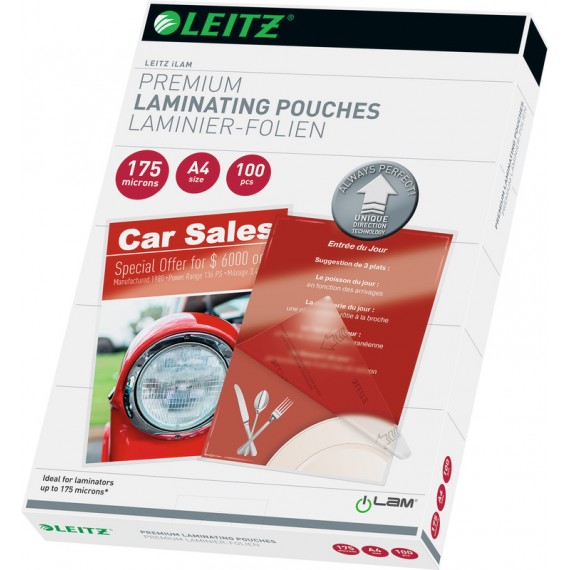 Pochettes de plastification LEITZ® iLAM UDT ouvertes sur 3 côtés, le système UDT (Unique Direction Technology) assure une manipulation aisée et un résultat parfait, utilisation facile grâce à l'indication du sens d'introduction, système anti-bourrage, plastification irréprochable. UDT: les flèches brevetées indiquant le sens d'insertion disparaissent après la plastification. format A4, 216 x 303 mm