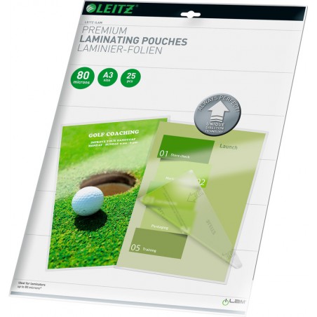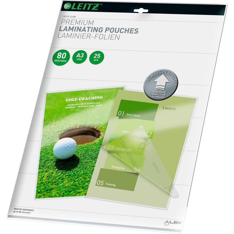 Pochettes de plastification LEITZ® iLAM UDT ouvertes sur 3 côtés, le système UDT (Unique Direction Technology) assure une manipulation aisée et un résultat parfait, utilisation facile grâce à l'indication du sens d'introduction, système anti-bourrage, plastification irréprochable. UDT: les flèches brevetées indiquant le sens d'insertion disparaissent après la plastification. format A3, 303 x 426 mm