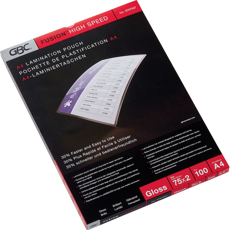 Pochettes de plastification GBC® de qualité premium ouvertes sur 3 côtés. format: A4, 216 x 303 mm, High Speed plastification 30% plus rapide, soudure sur le côté long, compatible uniquement avec les plastifieuses A3.