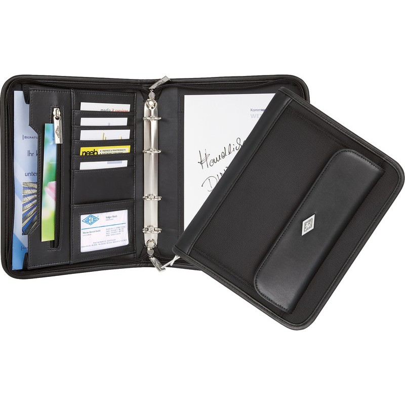 Porte-bloc conférencier WEDO® Elegance A5 combinaison de similicuir de haute qualité et nylon structuré, avec zip, mécanisme à 4 anneaux (Ø 30 mm, capacité 22 mm), emplacement pour bloc sans bloc-notes, languette porte-stylo, 5 poches pour cartes, pochette transparente pour cartes de visite, diverses poches zippées à l'intérieur et à l'extérieur, poche repliée A5, compartiment avec fermeture scratch, pour format A5. Dimensions: L 210 x H 263 x P 40 mm.
