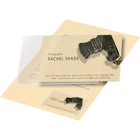 Porte-cartes de visite DJOIS PP 120 microns, transparents, autoadhésifs, avec encoche, format 95 x 60 mm. Durabilité eco:plus: recyclable, teneur en déchets recyclés après utilisation max. 67%.