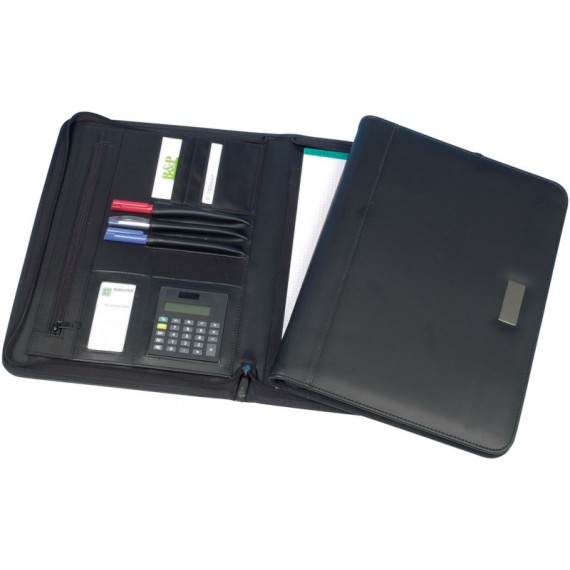 Porte-documents ARISTOS Nappalux en vachette pleine fleur nappa, avec fermeture à glissière, emplacement pour bloc avec bloc-notes, 4 compartiments pour cartes, diverses poches plates, poche zippée à l'intérieur, 3 languettes porte-stylo, pour format A4. Dimensions: L 270 x H 25 x P 360 mm.