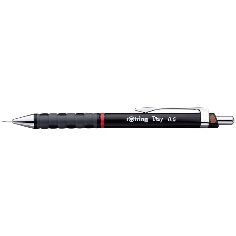 Portemine ROTRING Tikky noir corps en matière plastique avec repère de couleur, clip en métal, canon rigide, gomme. Durabilité eco:plus: construit pour être démontable, durée de vie du produit prolongée, emballage respectueux de l'environnement. pour mines 0,5 mm