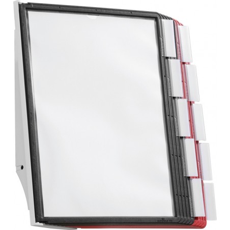 Système de présentation DURABLE Sherpa® Wall 10 support mural en PA renforcé de fibres de verre, se fixe facilement aux murs ou aux parois perforées, avec mécanisme à pivot pour une insertion et un retrait aisés des pochettes, extensible. Set composé de support mural, 10 pochettes antireflets pour format A4, de couleurs assorties, 10 cavaliers 58 mm avec insertions en bristol blanc et matériel de fixation, scannérisable. Garantie: 5 ans.