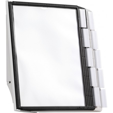 Système de présentation DURABLE Sherpa® Wall 10 support mural en PA renforcé de fibres de verre, se fixe facilement aux murs ou aux parois perforées, avec mécanisme à pivot pour une insertion et un retrait aisés des pochettes, extensible. Set composé de support mural, 10 pochettes antireflets pour format A4, de couleurs assorties, 10 cavaliers 58 mm avec insertions en bristol blanc et matériel de fixation, scannérisable. Garantie: 5 ans.