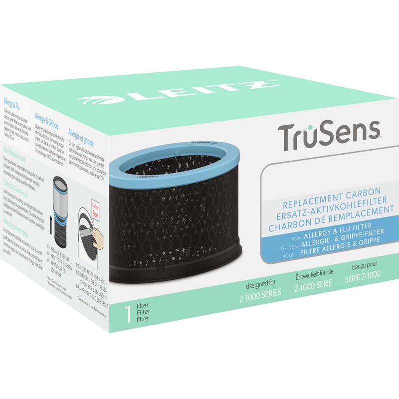 Filtre à charbon actif de rechange Allergie & Grippe Antivirale pour purificateur d'air LEITZ® TruSens(TM) le filtre à charbon actif élimine élimine les gaz organiques volatils (COV) et les odeurs de l'air ambiant et certaines odeurs de l'air, feutre à changer sur le tambour du filtre HEPA Allergie & Grippe, à changer tous les trois mois pour un résultat optimal, témoin lumineux pour le changement du filtre à charbon actif. Dimensions: H 14,24 mm, Ø 77,2 mm.