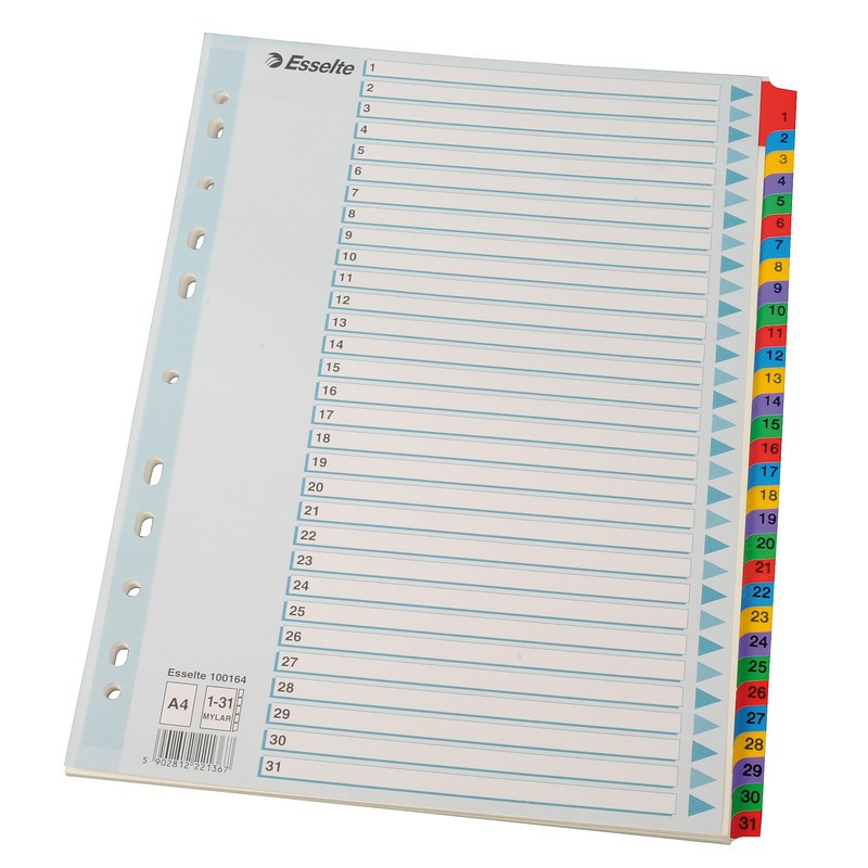 Répertoire plein format ESSELTE® en carton de couleur, onglets multicolores renforcés, bande perforée renforcée.