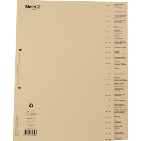Répertoire BIELLA pour décomptes de construction en carton recyclé, 170 g/m2, brun, 26 parties, 2 trous, format 210/240 x 297 mm, pour format A4, répertoire officiel du Centre suisse d'études pour la rationalisation de la construction CRB. Durabilité eco:plus: composant recyclé. Certification: FSC.