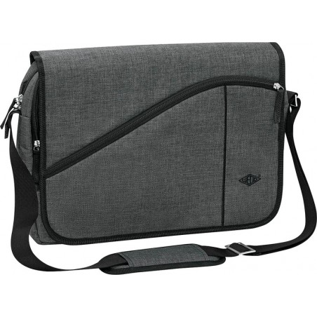Sac à bandoulière WEDO® Messenger Bag College en PES facile à entretenir, aspect lin, compartiment principal matelassé pour ordinateur portable jusqu'à 15,6', 2 compartiments zippés, partie organisée avec passe-câble et poches plates, petite poche plate au dos, avec bandoulière rembourrée et ajustable. Dimensions: L 400 x H 300 x P 100 mm. Poids: 780 g.