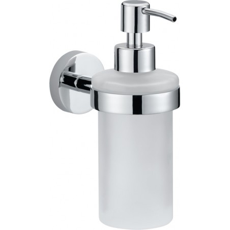 Distributeur TESA® Smooz pour savon et désinfectant en métal chromé, inoxydable, le flacon en verre dépoli d'une capacité de 200 ml est amovible et peut être lavé, avec technologie TESA® Power.Kit brevetée, amovible, applicable sur le carrelage, le métal, la pierre naturelle, le marbre, le bois, le verre et différents types de plastique. Dimensions: L 70 x H 170 x P 126 mm.
