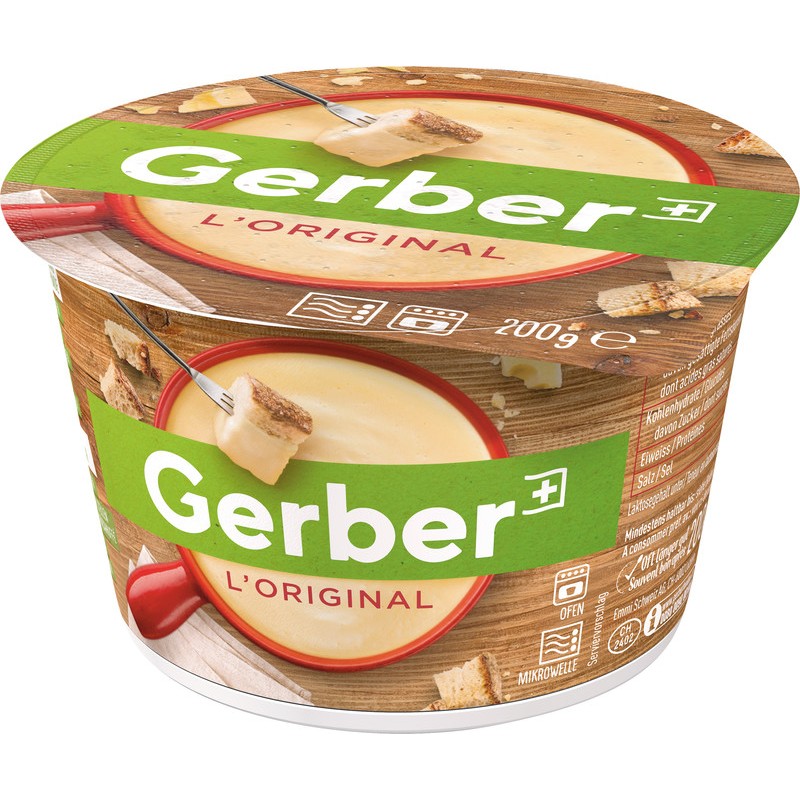 Fondue GERBER fromage 100% suisse aux ingrédients naturels, pasteurisé, contient de l'alcool, sans conservateurs, sans lactose, à réchauffer au micro-ondes ou au four. Pièce de 200 g.