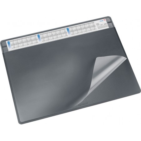 Sous-main LÄUFER® Durella Soft en PVC, lavable et entièrement recyclable, avec film transparent antireflet interchangeable, structure en 3 couches, dessous en mousse synthétique/feutrine, dessous et couche supérieure, durable, bonne adhérence, calendrier, multiples utilisations, idéal pour insérer des documents qui doivent être protégés tout en restant à portée de main. Dimensions: L 650 x H 500 mm.
