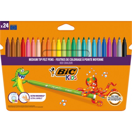 Feutres de coloriage BIC® Kid Couleur Kids pointe pinceau indéformable et résistante, encre à base d'eau, s'élimine facilement à l'eau sur la plupart des textiles et les mains, largeur de trait 0,8 mm, dans étui en carton.
