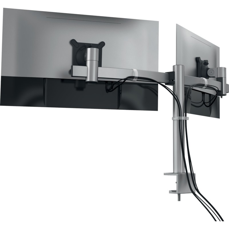 Support pour 2 écrans DURABLE en aluminium et matières plastiques haut de gamme (jusqu'à 60% de matériaux recyclés), 100% recyclable, pour écrans plats et incurvés jusqu'à 8 kg et 21 - 27', angle de vision réglable individuellement de +25° à +85°, écrans inclinables à +110°, écrans pivotant à 360°, utilisation des écrans au format portrait ou paysage, bras articulé réglable en hauteur de 50 - 340 mm, à fixer et déplacer le long de la barre transversale, pour une épaisseur de plateau de 14 - 44 mm, avec fixation VESA 75 x 75 mm ou 100 x 100 mm, livré avec matériel de montage et 5 serre-câbles pour dire adieu aux câbles en désordre. Dimensions: L 780 x H 445 x P 190 mm. Garantie: 10 ans. avec pince de fixation pour table argent métallique