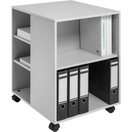 Desserte multifonctions DURABLE 74/59 ouverte en bois, desserte polyvalente, ouverte sur 3 côtés, avec 6 tablettes et 1 plateau pour ranger des classeurs, etc., capacité de charge max. env. 60 kg, chaque tablette peut supporter jusqu'à 25 kg, équipée de 4 roulettes dont 2 avec frein, livrée démontée avec les instructions de montage. Dimensions: L 528 x H 748 x P 592 mm.