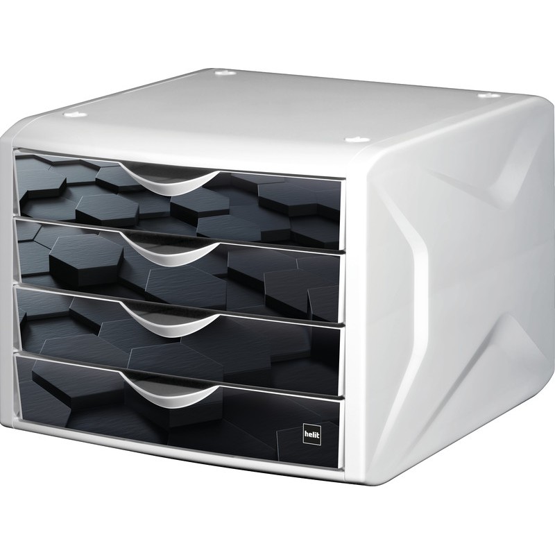Module à tiroirs HELIT the chameleon en PP, avec 4 tiroirs fermés, caisson blanc, superposable, arrêt de tiroir, pour format A4. Dimensions extérieures: L 260 x H 212 x P 330 mm. Durabilité eco:plus: durée de vie du produit prolongée, recyclable, teneur en déchets recyclés après utilisation max. 100%, réduction des déchets, emballage respectueux de l'environnement. 4 tiroirs fermés