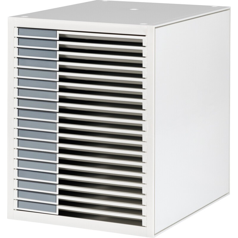 Module à tiroirs STYROKAY en PS, avec matériel d'inscription, caisson et tiroirs blancs, pour format A4. Dimensions extérieures: L 270 x H 340 x P 345 mm.