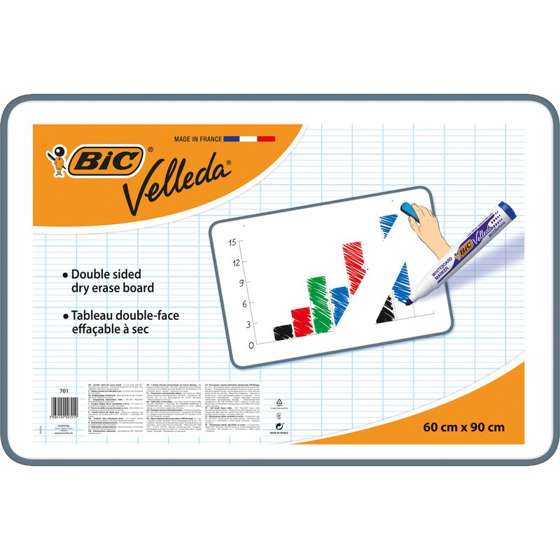 Tableau blanc BIC® VELLEDA® surface blanc, avec cadre en plastique coloré, utilisable au format portrait ou paysage, utilisable des deux côtés avec des marqueurs pour tableaux blancs, effaçable à sec.
