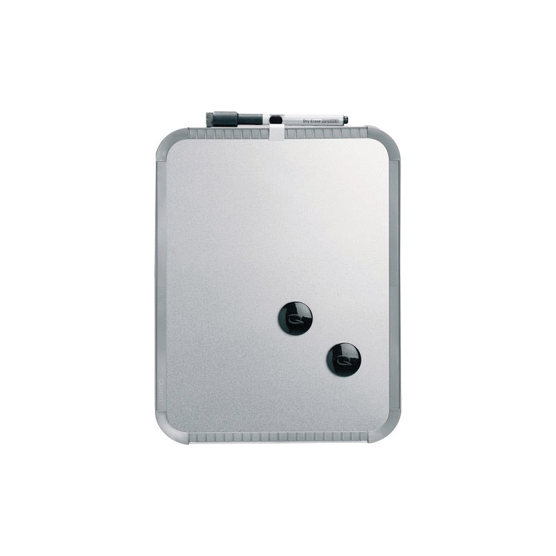 Tableau magnétique NOBO® pour l'inscription avec des marqueurs effaçables à sec, surface magnétique, livré avec marqueur avec éponge intégrée et support magnétique, 2 aimants, bandes adhésives et bandes magnétiques, pour le montage mural au format portrait ou paysage. cadre en plastique argent métallisé, surface argent