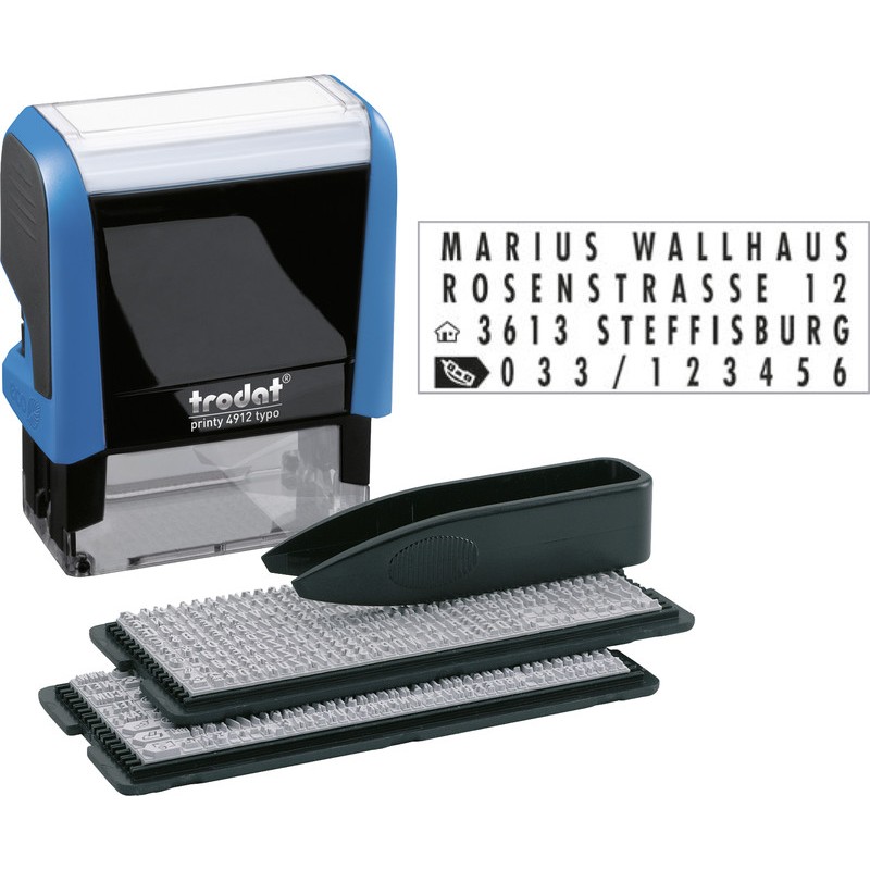 TRODAT® Typomatic 4.0 Printy(TM), timbre à encrage automatique à composer soi-même production neutre en CO2 de série, avec coussin d'encrage trodat® interchangeable encré noir. 4912 typo, plaque 47 x 18 mm texte max. 4 lignes. 1 jeu de caractères en caoutchouc hauteur 3 mm (328 caractères) et 1 jeu de caractères hauteur 4 mm (264 caractères). Coussin 6/4912.