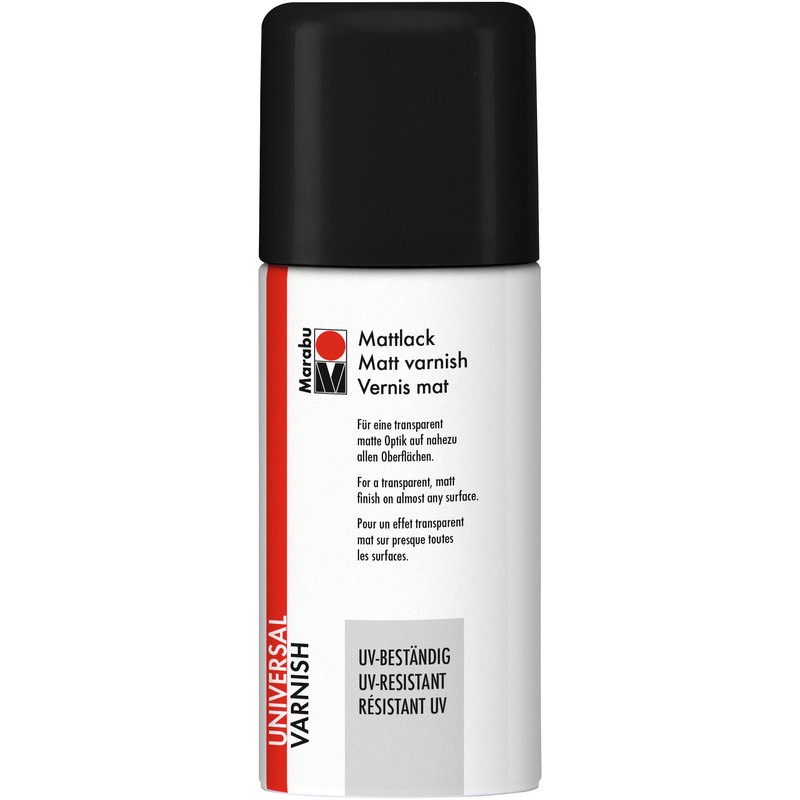 Vernis anti UV mat MARABU vernis incolore mat en bombe aérosol, sèche rapidement, résistant à l'eau et aux UV, pour papier, carton, photos, métal, bois, verre, etc., convient pour le polystyrène expansé. Bombe de 150 ml. Durabilité eco:plus: recyclable.